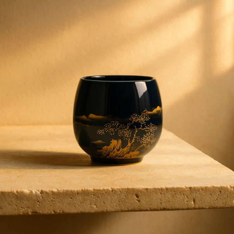 This rounded cup celebrates simple beauty: deep night-blue glaze, delicate gold landscape and a palm-filling silhouette that feels calm and stable. It pairs naturally with linen, cedar and stone to anchor a serene tablescape, the spirit of a handmade japanese tea cup refined for everyday rituals.