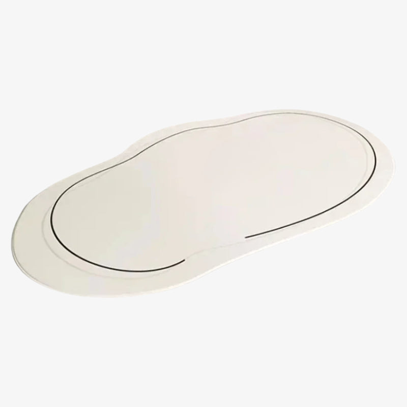 The organic pebble shape centers the room with calm flow. Its bright surface pairs with pale wood and linen, creating a serene focal point that celebrates imperfect beauty in Wabi Sabi style as a refined white carpet with black lines.