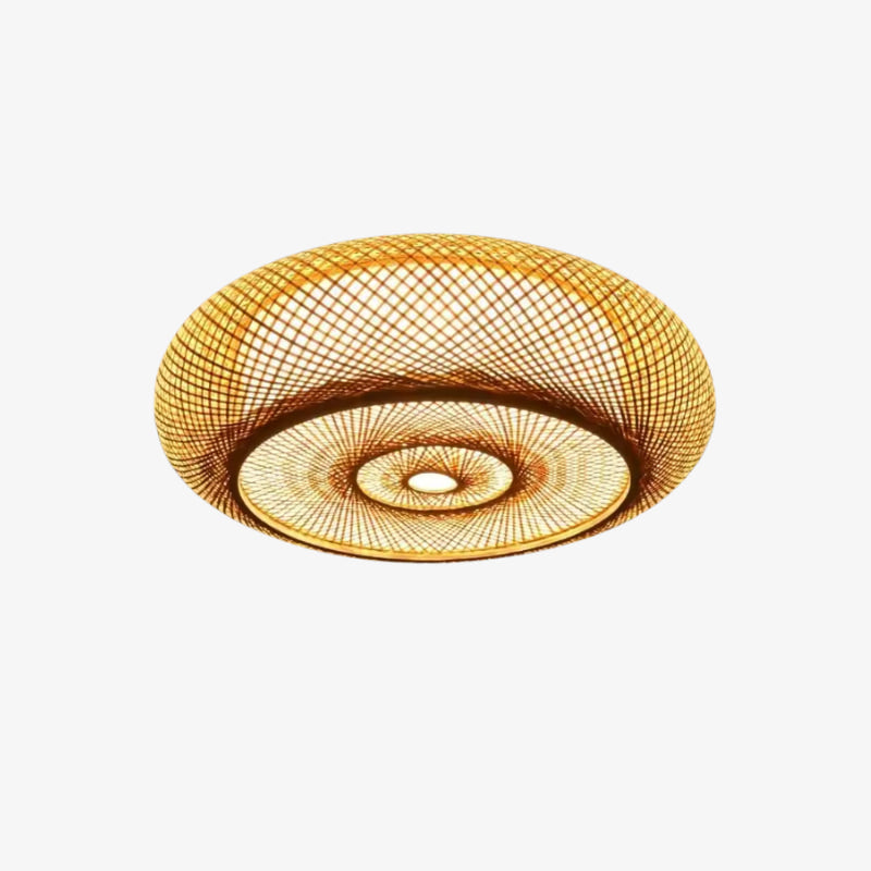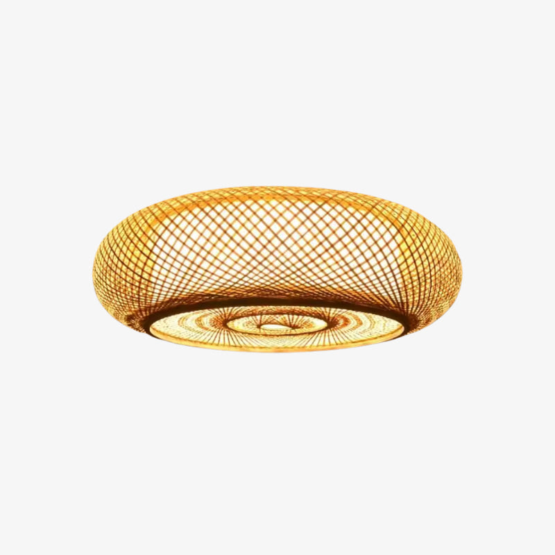 This low-profile design features a handwoven bamboo ring that diffuses light into a gentle halo and paints subtle patterns on nearby walls. The round silhouette keeps sightlines open and turns the fixture into quiet sculpture, perfect for dining rooms, entries, and serene bedrooms where a wabi sabi ceiling lamp completes a warm, grounded palette.