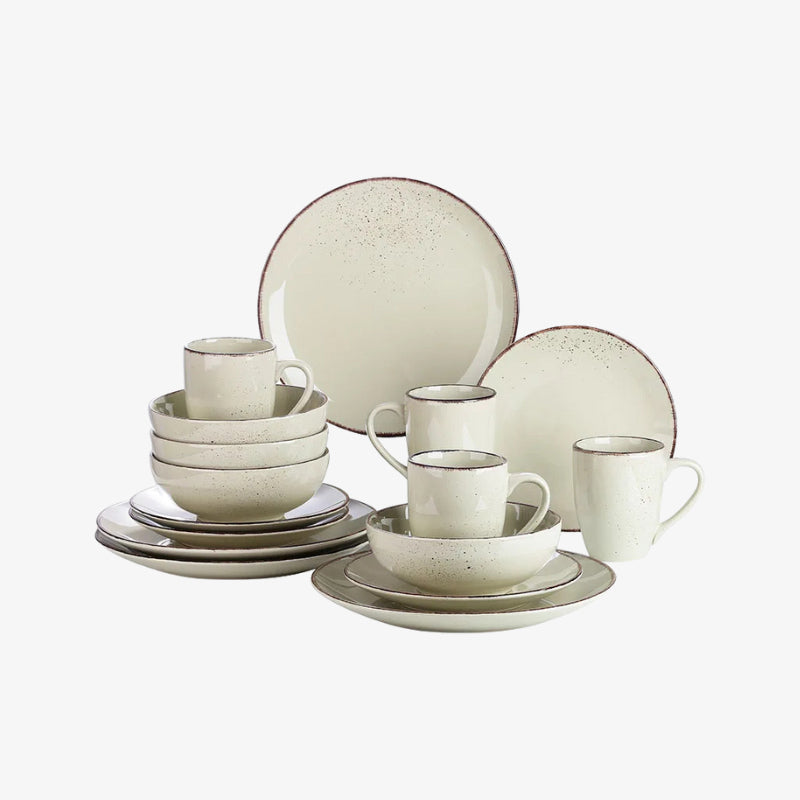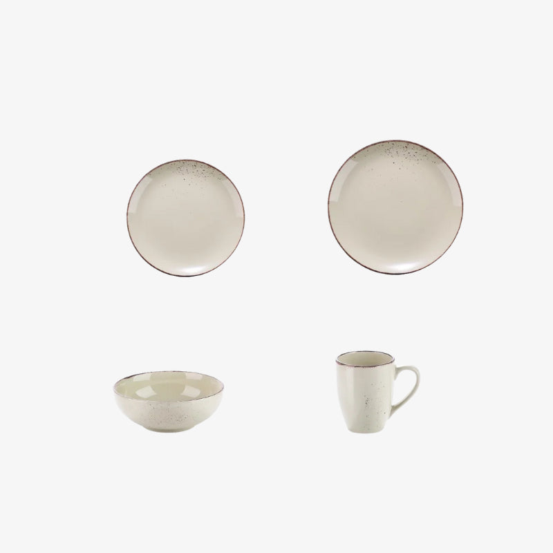 This speckled ivory stoneware arrives as a ceramic dining table set with a thin brown rim that frames food like a kintsugi line. The pieces feel substantial yet balanced, so you set a soothing scene for weeknight dinners and weekend gatherings. Each service layers naturally on pale wood or linen and aligns with the quiet harmony of chashitsu-inspired interiors.