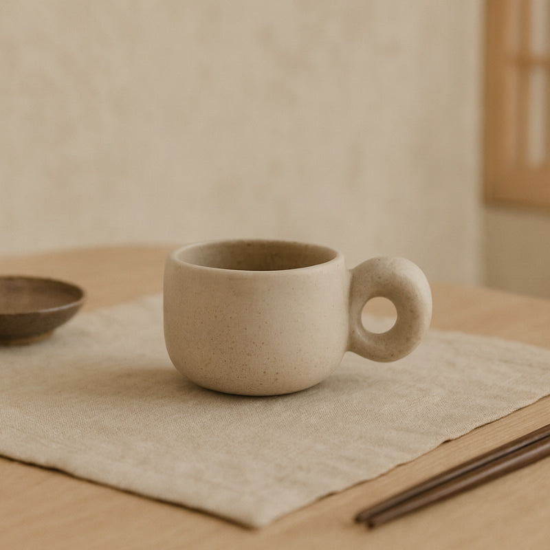 Choose the petite ring-handle cup or the taller barrel form to suit espresso, hojicha, or cocoa. Subtle speckles and organic curves celebrate artisanal character, the essence of handmade ceramic mugs that anchor a balanced Japandi interior.