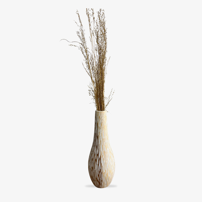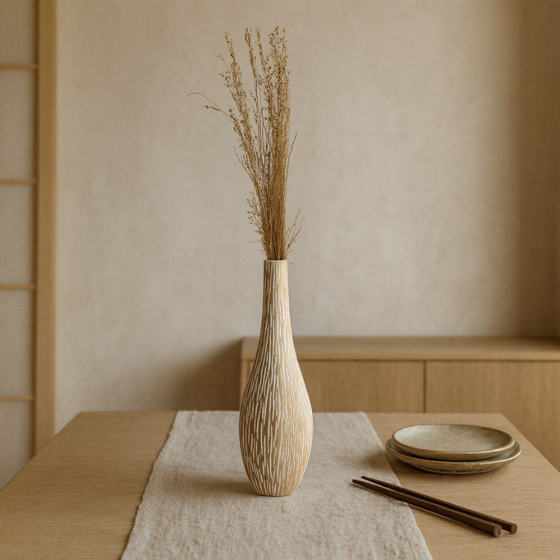The slim drop silhouette feels calm and grounded, with hand-brushed white lines that highlight the natural pattern. Artisans carve and paint the piece to create a tactile wood carved vase that pairs beautifully with linen, stone, and quiet neutral palettes.