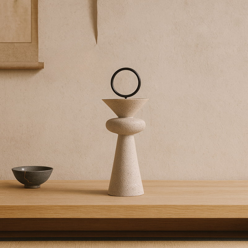 Pair one piece with pale oak, linen, and a simple clay vase, or group two heights for a serene dialogue. The stone-look body meets a sleek top element in hand-finished decorative iron, celebrating Japanese simplicity through asymmetry, honest materials, and generous breathing space.