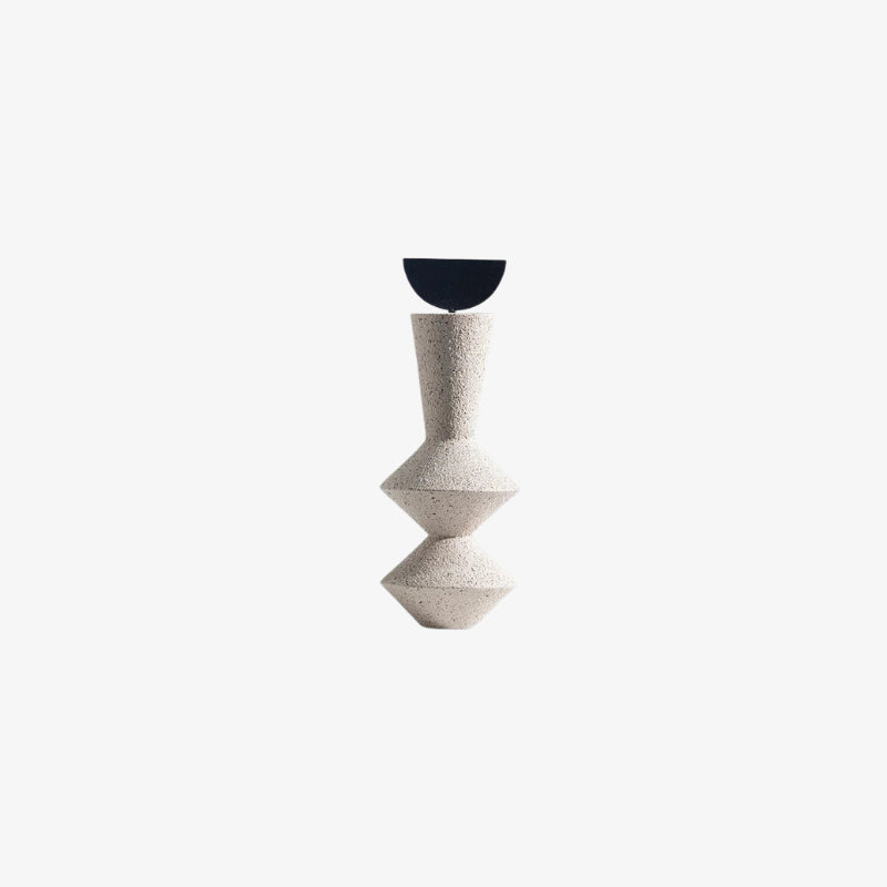 Stacked cones and gentle curves rise in a balanced column with sandy texture that catches the light. A matte black disc crowns the form like a moon, giving your shelf or console a focused accent and a subtle decorative circle motif that feels refined and calm.