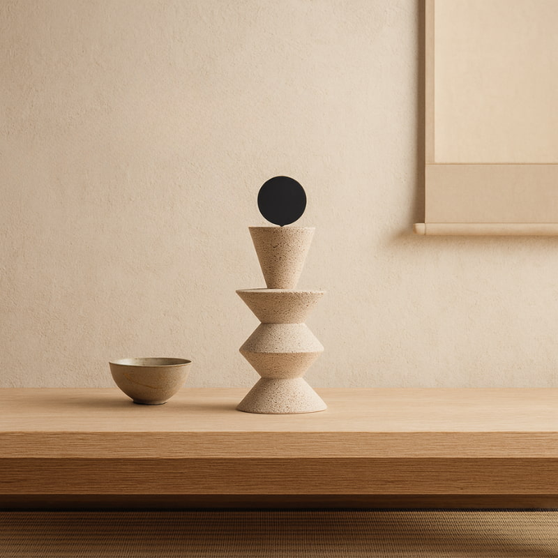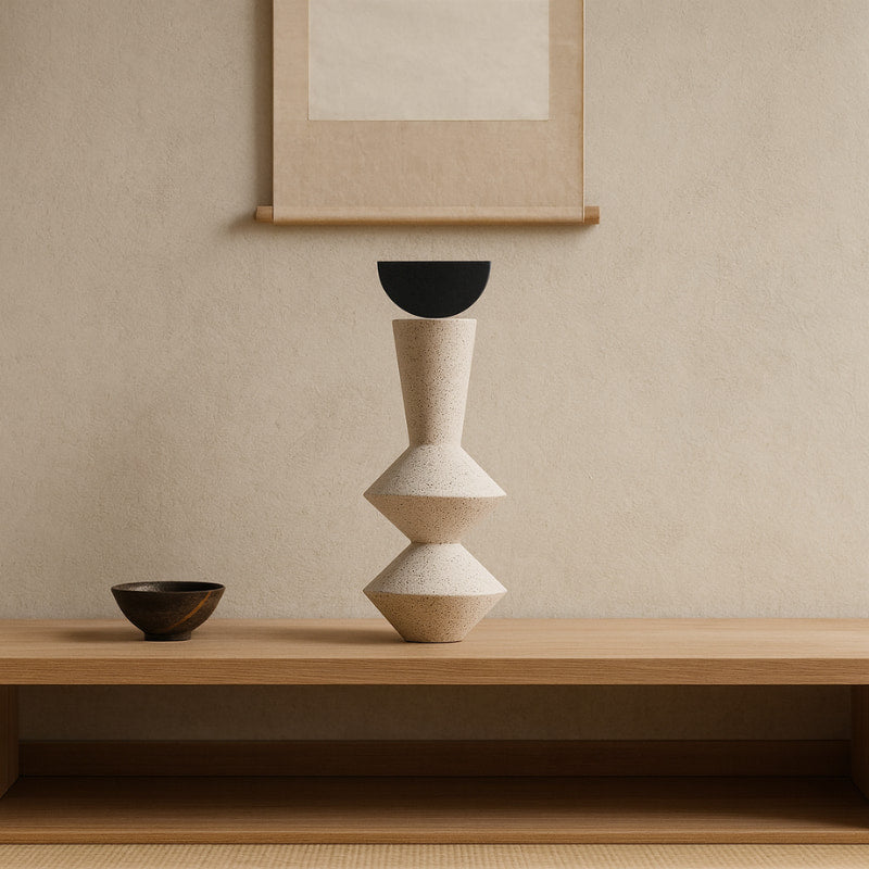 Geometric totems in soft mineral tones bring quiet rhythm to your home, a sculptural nod to wabi sabi abstract art