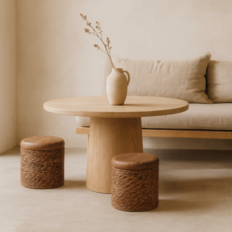Ground your space with a wabi sabi brown ottoman in warm woven fiber and a soft seat
