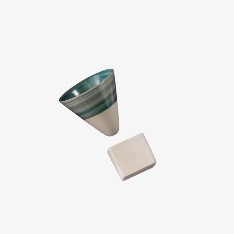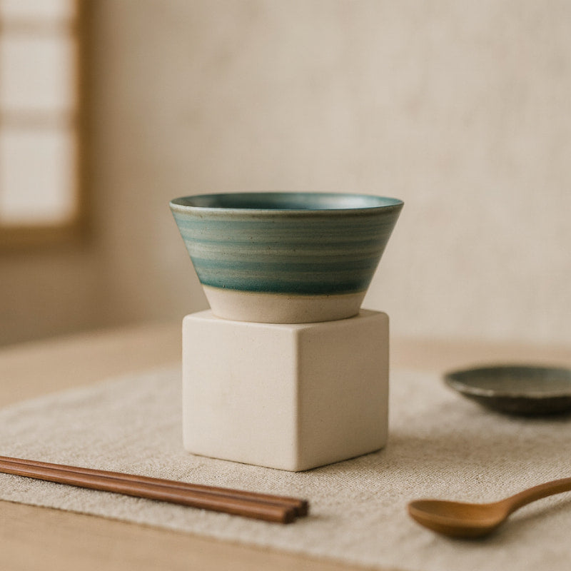 The conical bowl rests on a square base to create a small centerpiece for your tray or tokonoma shelf. The interior glow of the ocean hue turns every sip into a ritual, perfect as a blue cup of coffee for quiet mornings or evening tea.
